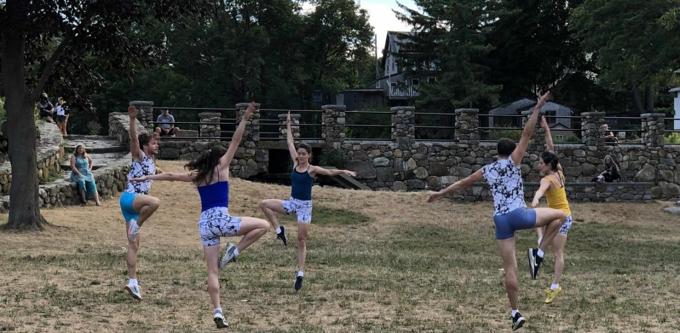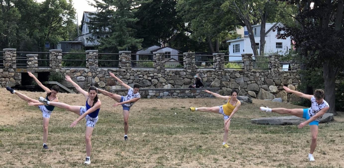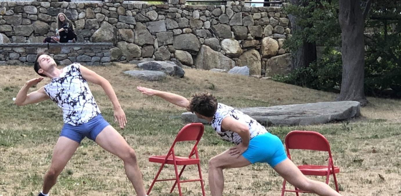 “Squaring into Space,” created in fall 2020, is a playful and robust dance work choreographed for performance in large alternative spaces both outdoors and indoors, with a mix of athletic, elegant and pedestrian material designed to hold the eye and animate these outsized venues. Driven by a full-throttle dance language, contrasting and layered movement activities boldly showcase the dancers cavorting on and around a set of eight bright red folding chairs. This piece celebrates resiliency through the joy of movement.