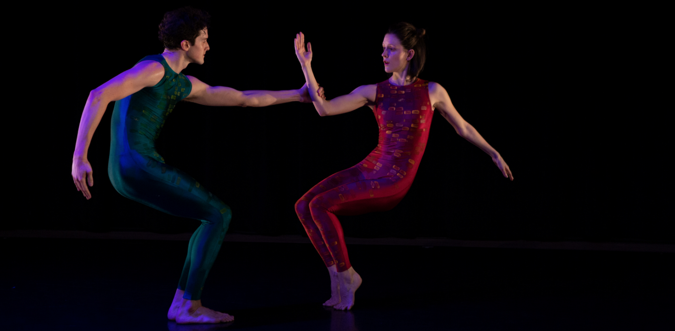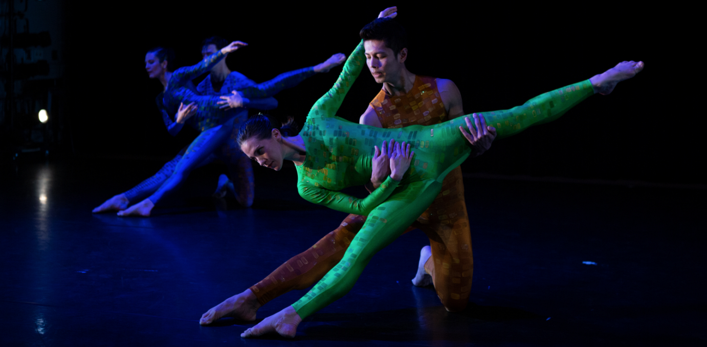 A luscious and playful work, Close-Up employs a movement language mixing robust dance phrases with gestures and facial expressions. The contrast between the large scale and the intimate scale of the material pulls the eye’s focus back and forth between the breadth of the full stage space to the intimacy of the gestures, from the thrill of an expansive leap to the minutia of a beckoning finger. The dancers’ interactions with each other and the three set pieces create at times playful and humorous scenarios. With this work, the viewer is stimulated by the boldness of the dancing and at the same moment is brought ‘close-up’ to the material, experiencing a window into the performer's emotional landscape. With a richly textured and at times melodic musical score by composer Andreas Brade and a visually arresting stage design by Andrew Jordan—costumes with the dancers’ images printed on the fabric paired with a three-piece set—this work beguiles and amuses.